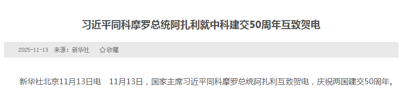 - 习近平同科摩罗总统阿扎利就中科建交50周年互致贺电2025-11-13